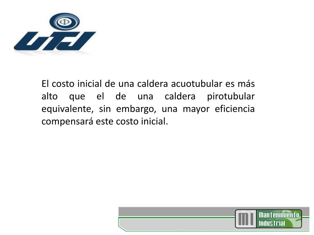 El costo inicial de una caldera acuotubular es más alto que el de una caldera pirotubular equivalente, sin embargo, una mayor eficiencia compensará este costo inicial.