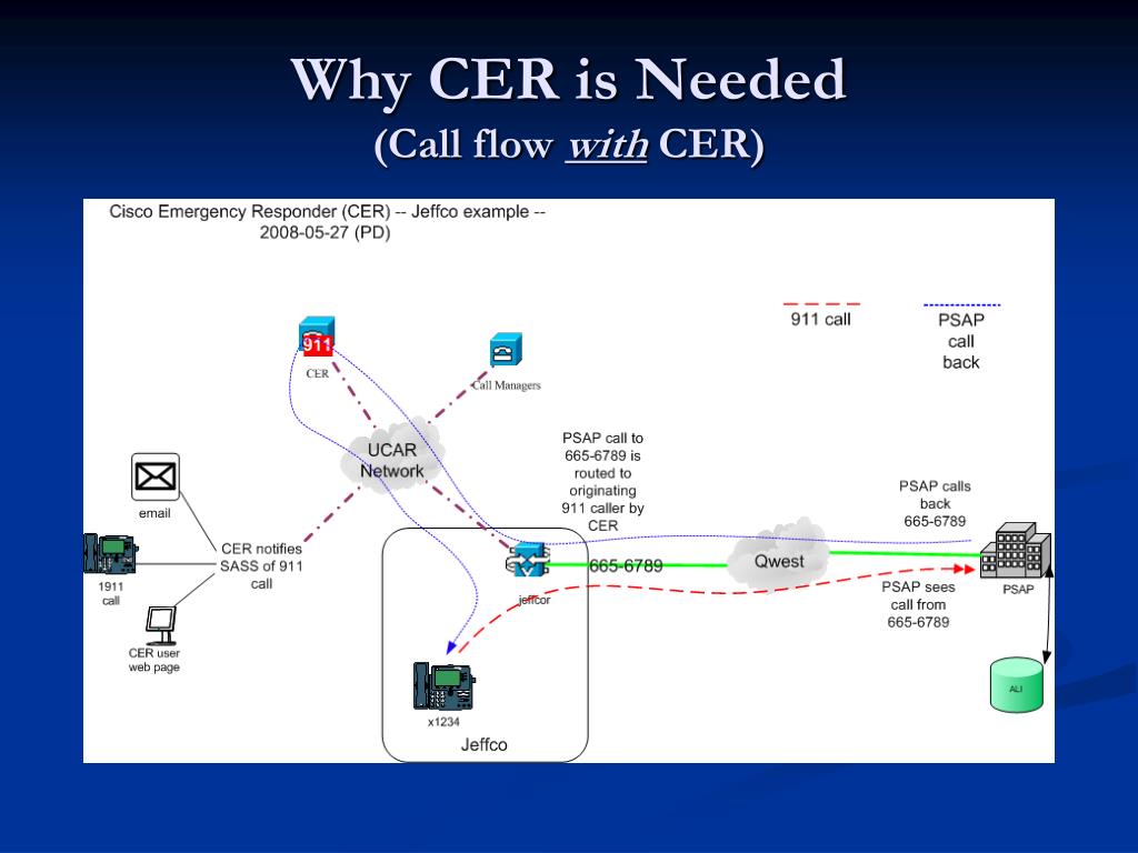 What is CER? • Cisco Emergency Responder • An application running on a pair of servers (primary and hot standby) that provide emergency service personnel with the call back and location information of the caller.