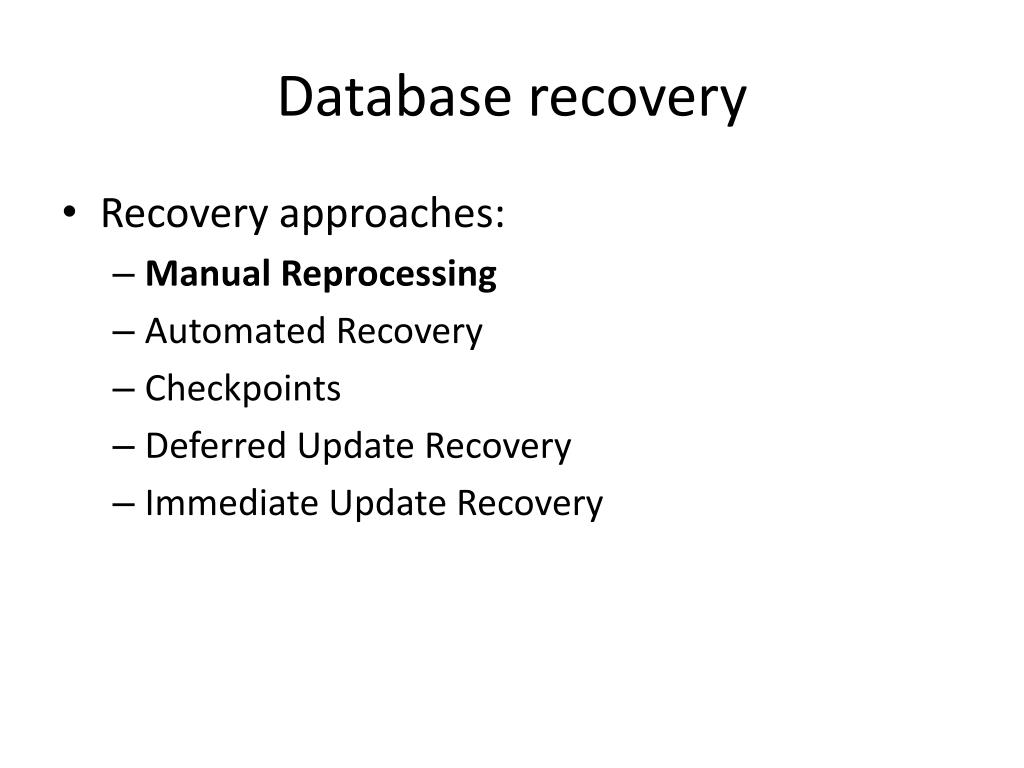 Database recovery • Overview: • Manual Reprocessing • Automated Recovery • Checkpoints • Deferred Update Recovery • Immediate Update Recovery