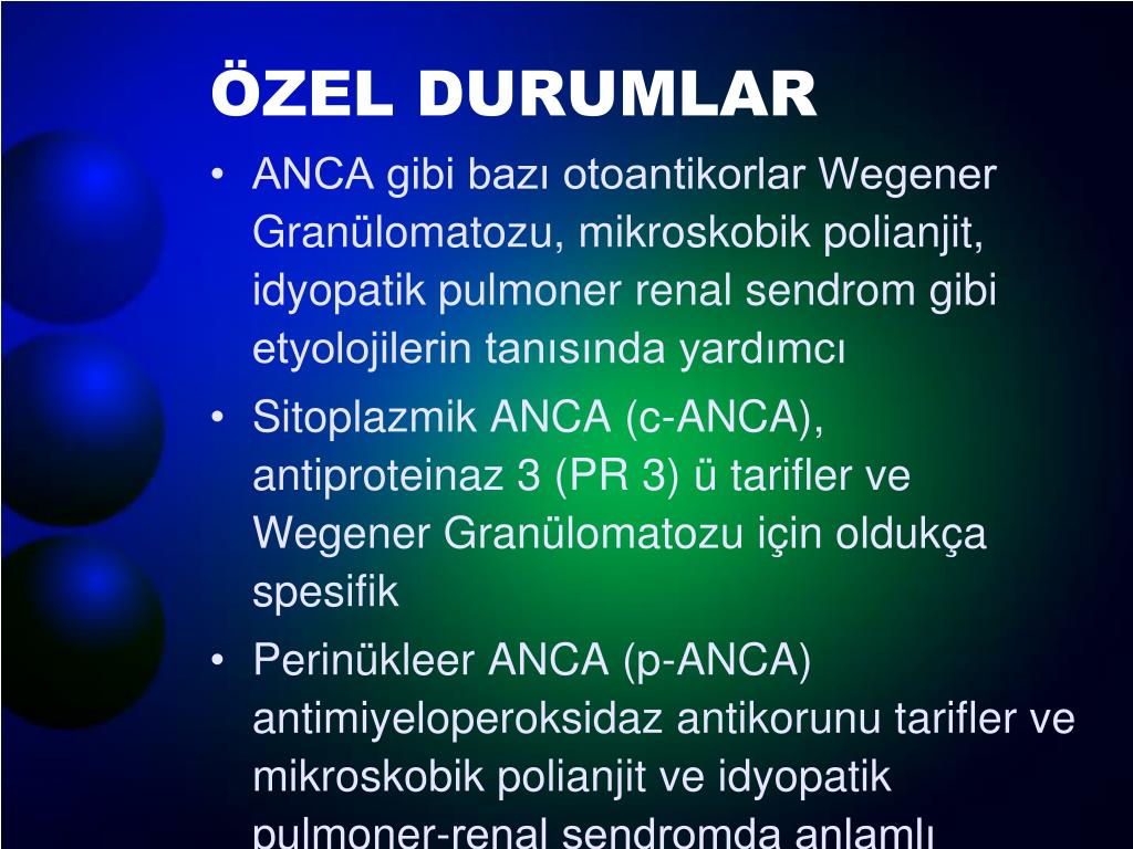 ÖZEL DURUMLAR • ANCA gibi bazı otoantikorlar Wegener Granülomatozu, mikroskobik polianjit, idyopatik pulmoner renal sendrom gibi etyolojilerin tanısında yardımcı • Sitoplazmik ANCA (c-ANCA), antiproteinaz 3 (PR 3) ü tarifler ve Wegener Granülomatozu için oldukça spesifik • Perinükleer ANCA (p-ANCA) antimiyeloperoksidaz antikorunu tarifler ve mikroskobik polianjit ve idyopatik pulmoner-renal sendromda anlamlı