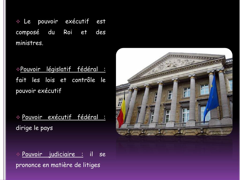 Le pouvoir exécutif est composé du Roi et des ministres. Pouvoir législatif fédéral : fait les lois et contrôle le pouvoir exécutif Pouvoir exécutif fédéral : dirige le pays Pouvoir judiciaire : il se prononce en matière de litiges