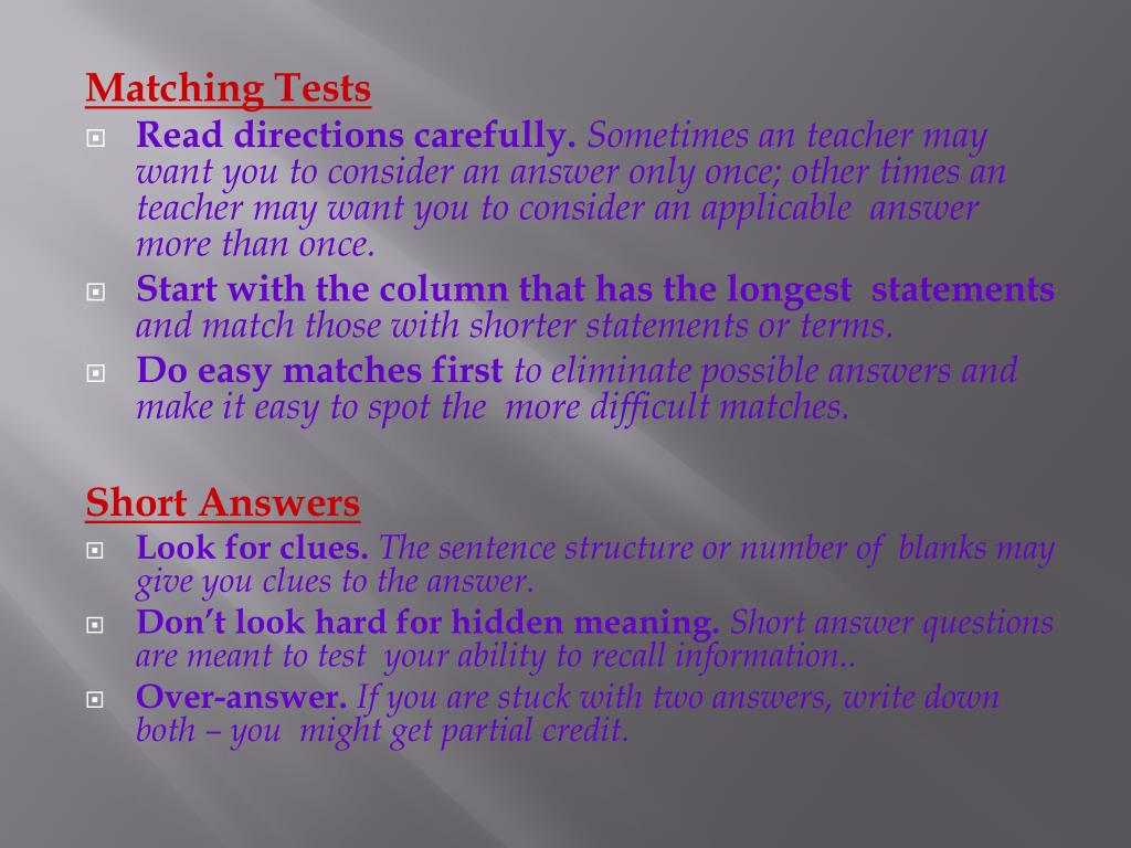 Matching Tests • Read directions carefully. Sometimes an teacher may want you to consider an answer only once; other times an teacher may want you to consider an applicable answer more than once. • Start with the column that has the longest statements and match those with shorter statements or terms. • Do easy matches first to eliminate possible answers and make it easy to spot the more difficult matches. Short Answers • Look for clues. The sentence structure or number of blanks may give you clues to the answer. • Don’t look hard for hidden meaning. Short answer questions are meant to test your ability to recall information.. • Over-answer. If you are stuck with two answers, write down both – you might get partial credit.