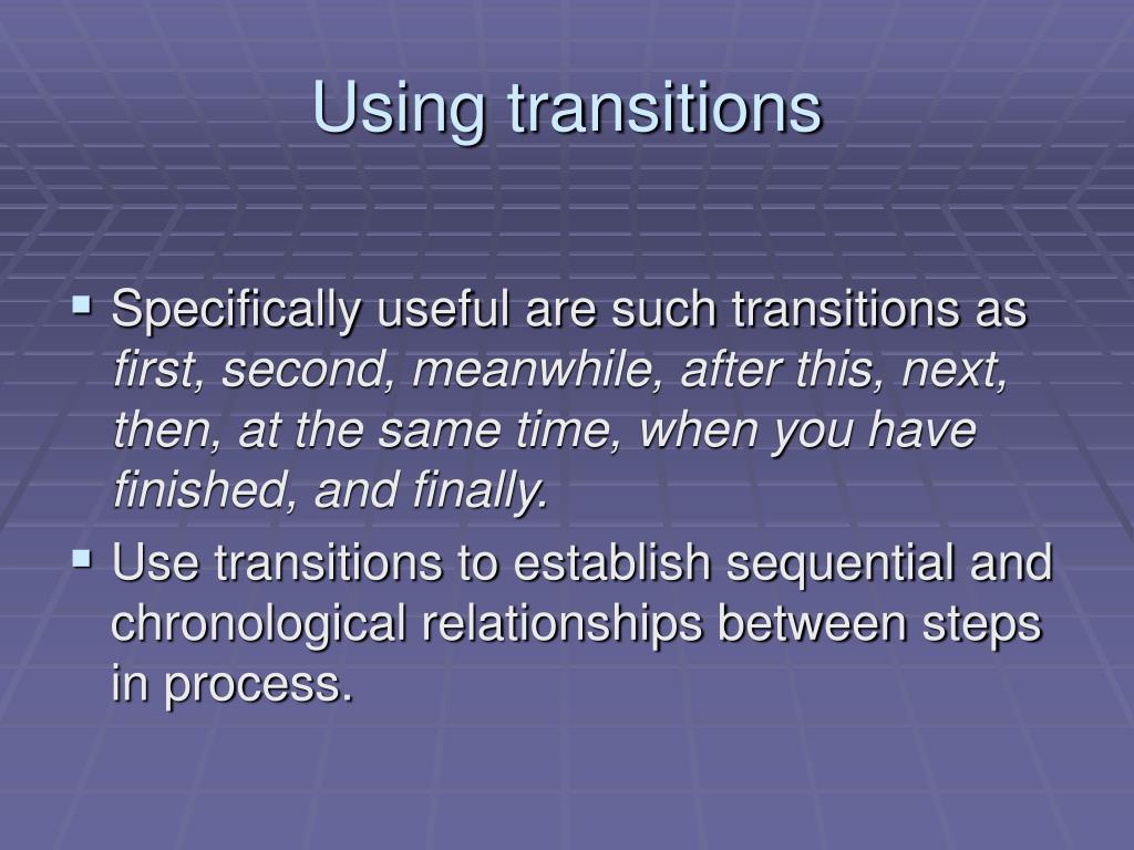 Using transitions • Specifically useful are such transitions as first, second, meanwhile, after this, next, then, at the same time, when you have finished, and finally. • Use transitions to establish sequential and chronological relationships between steps in process.