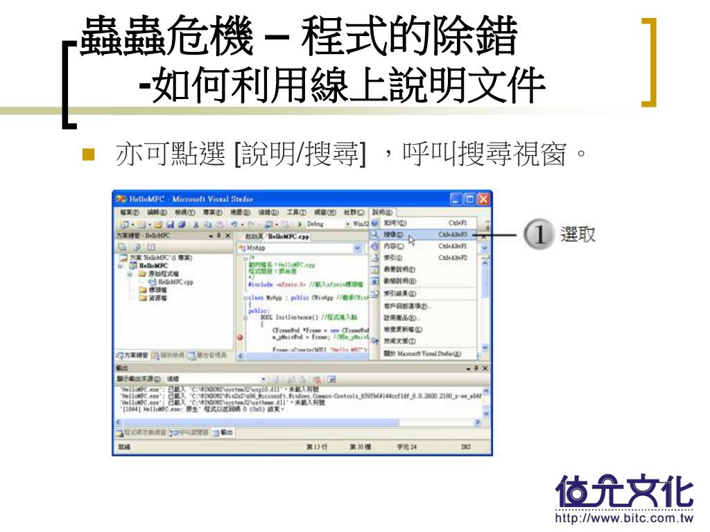 蟲蟲危機 – 程式的除錯-如何利用線上說明文件 • 亦可點選 [說明/搜尋] ,呼叫搜尋視窗。