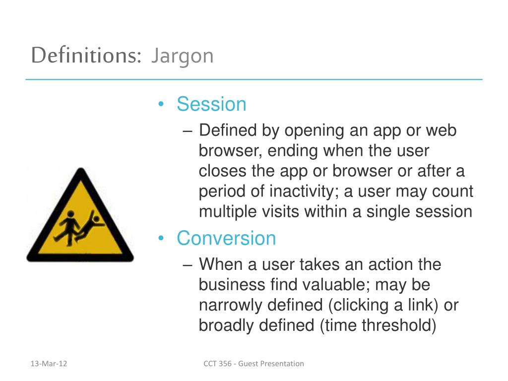 Definitions: Jargon • Measure or Metric • A count of people, browsers or mobile devices; or count of an action taken by a person • A metric may be calculated from two or more measures CCT 356 - Guest Presentation