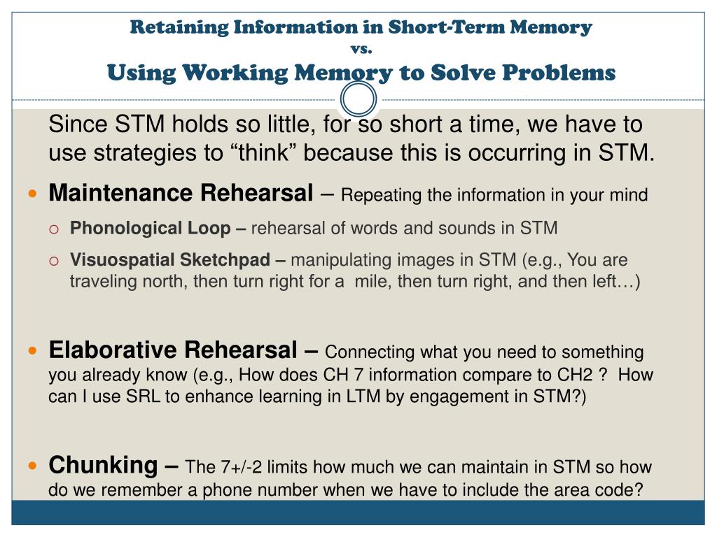 Retaining Information in Short-Term Memoryvs.Using Working Memory to Solve Problems Since STM holds so little, for so short a time, we have to use strategies to “think” because this is occurring in STM. • Maintenance Rehearsal – Repeating the information in your mind • Phonological Loop – rehearsal of words and sounds in STM • Visuospatial Sketchpad – manipulating images in STM (e.g., You are traveling north, then turn right for a mile, then turn right, and then left…) • Elaborative Rehearsal – Connecting what you need to something you already know (e.g., How does CH 7 information compare to CH2 ? How can I use SRL to enhance learning in LTM by engagement in STM?) • Chunking – The 7+/-2 limits how much we can maintain in STM so how do we remember a phone number when we have to include the area code?