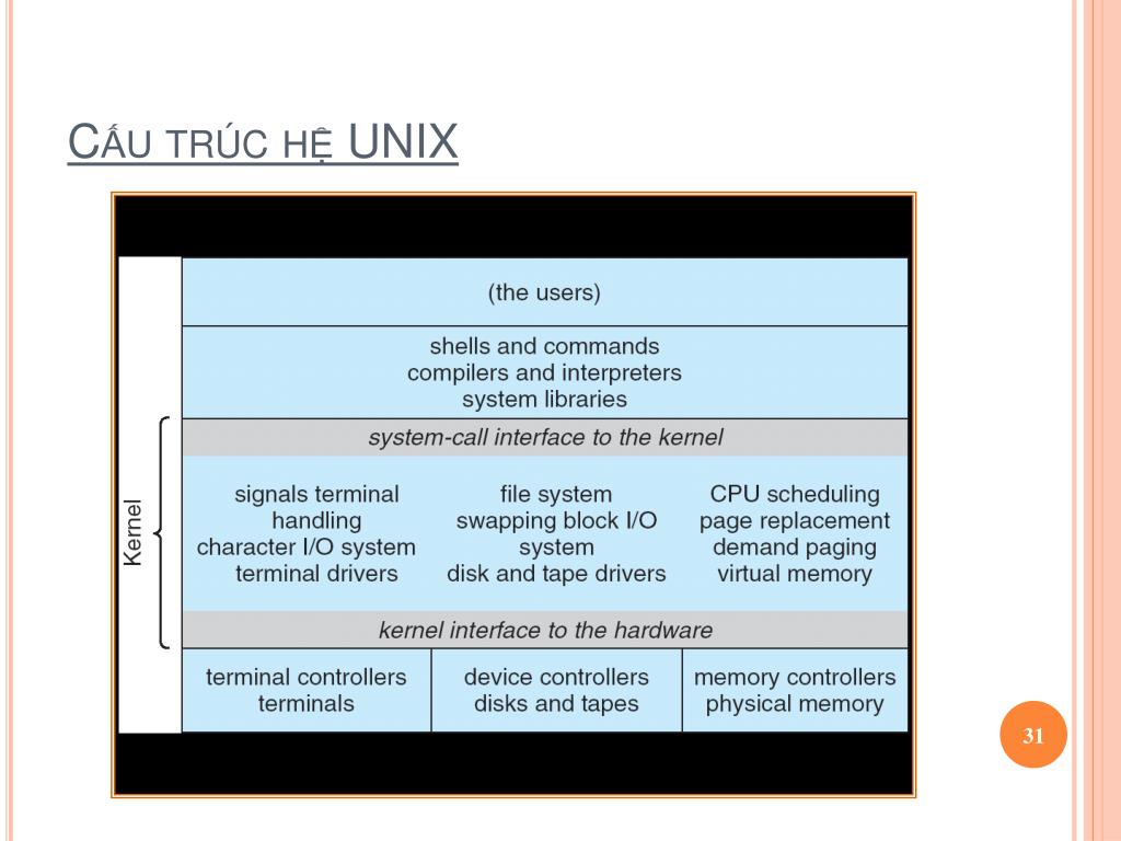 Hệ điều hành UNIX • UNIX – được giới hạn bởi những chức năng phần cứng, nguyên bản hệ điều hành UNIX đã có cấu trúc bị giới hạn. hệ điều hành UNIX bao gồm 2 thành phần • Hệ thống chương trình • Kernel(nhân) • Bao gồm cả những thứ trên giao diện hệ thống cuộc gọi và trên phần cứng vật lý • Cung cấp hệ thống dữ liệu, điều khiển CPU, quản lý bộ nhớ, và những chức năng hệ điều hành khác; có nhiều chức năng cho một cấp độ