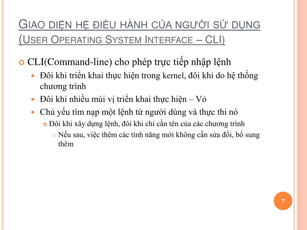 Giao diện hệ điều hành của người sử dụng(User Operating System Interface – CLI) • CLI(Command-line) cho phép trực tiếp nhập lệnh • Đôi khi triển khai thực hiện trong kernel, đôi khi do hệ thống chương trình • Đôi khi nhiều mùi vị triển khai thực hiện – Vỏ • Chủ yếu tìm nạp một lệnh từ người dùng và thực thi nó • Đôi khi xây dựng lệnh, đôi khi chỉ cần tên của các chương trình • Nếu sau, việc thêm các tính năng mới không cần sửa đổi, bổ sung thêm