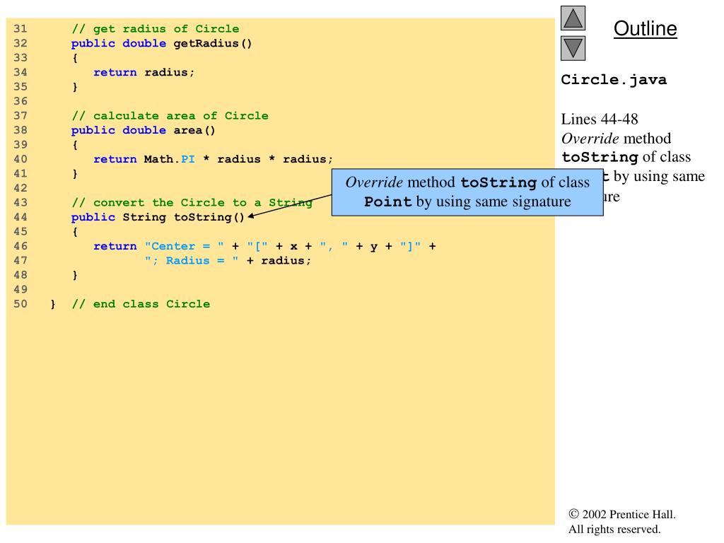 Override method toString of class Point by using same signature 31 // get radius of Circle 32 public double getRadius() 33 { 34 return radius; 35 } 36 37 // calculate area of Circle 38 public double area() 39 { 40 return Math.PI * radius * radius; 41 } 42 43 // convert the Circle to a String 44 public String toString() 45 { 46 return"Center = " + "[" + x + ", " + y + "]" + 47 "; Radius = " + radius; 48 } 49 50 } // end class Circle Circle.javaLines 44-48Override method toString of class Point by using same signature