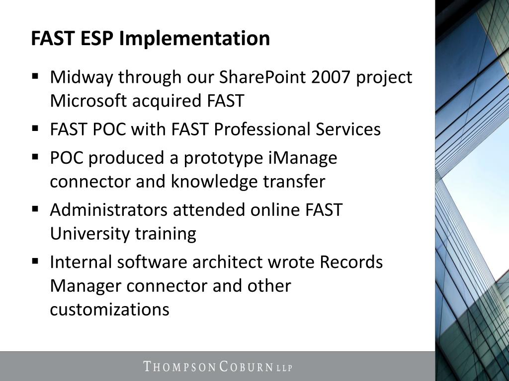 Thompson Coburn Environment • 750 people, 350 attorneys, 4 offices • Windows 7 / Office 2010 • Autonomy iManage Document Management • Autonomy Records Manager (FileSurf) • SharePoint 2007 Intranet and team sites • FAST ESP Search Engine • SharePoint 2010 / FAST4SP project in progress • SharePoint DMS/RMS project in progress