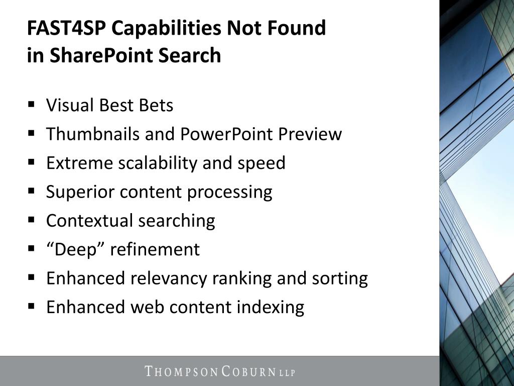 Enterprise Search with FAST. Rick McDannel Manager of Information Technology. Agenda. Thompson Coburn Environment FAST Search Decision and Implementation Search Engine Comparison Lessons Learned. Thompson Coburn Environment. 750 people, 350 attorneys, 4 offices Windows 7 / Office 2010