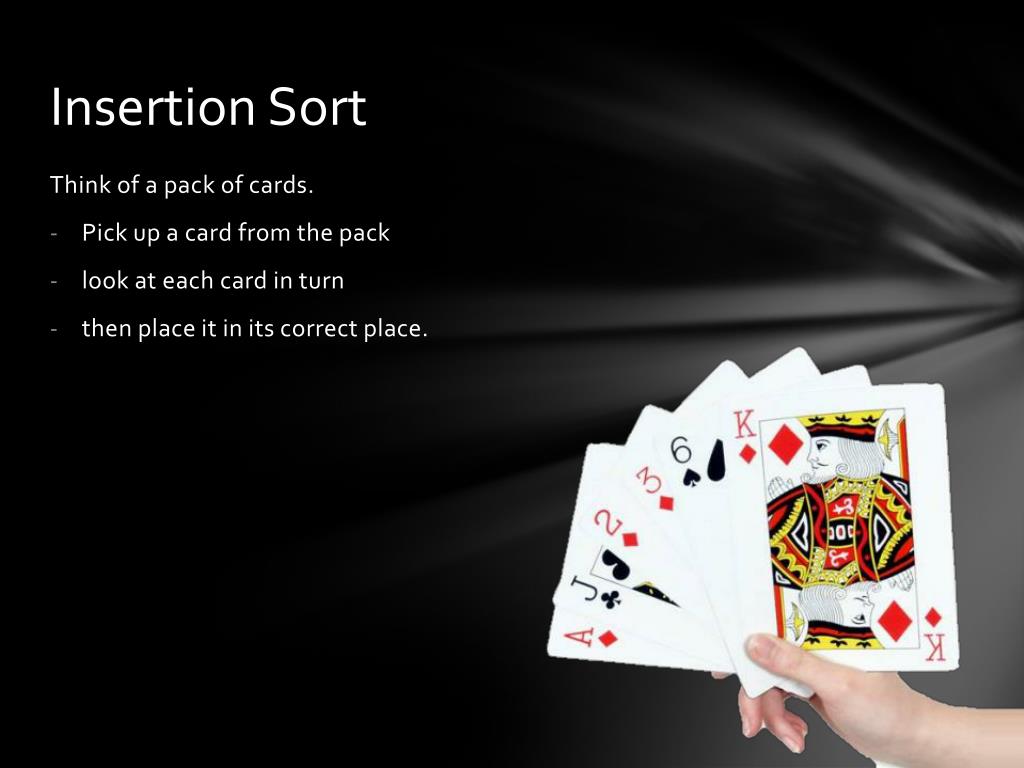 Insertion Sort • Think of a pack of cards. • Pick up a card from the pack • look at each card in turn • then place it in its correct place.