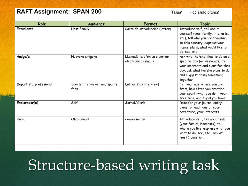 Tasks can be designed to develop any of the four language skills: listening, speaking, reading and writing. Ideally, our tasks will be integrative (involve more than one skill). Although there are different types of TASKS, we will focus on structure-based tasks. In other words, rather than an incidental focus on form in the course of completing the task, there is prior selection of linguistic elements to practice-- task-based, planned focus on form but still with a primary focus on meaning. This is more accurately called ‘task-supported’ language teaching and is, admittedly, a weaker form of communicative teaching, but still uses language purposefully. IDEALLY, attention to form occurs within the context of performing the task!!