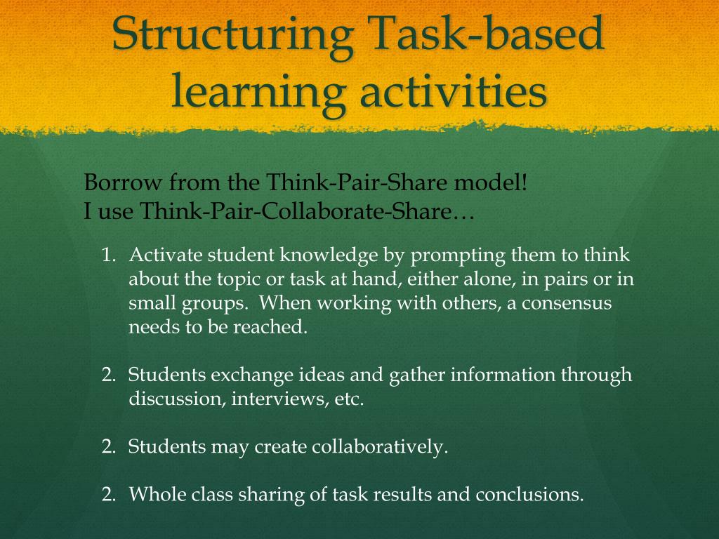 Structuring Task-based learning activities Borrow from the Think-Pair-Share model! I use Think-Pair-Collaborate-Share… Activate student knowledge by prompting them to think about the topic or task at hand, either alone, in pairs or in small groups. When working with others, a consensus needs to be reached. Students exchange ideas and gather information through discussion, interviews, etc. Students may create collaboratively. Whole class sharing of task results and conclusions.