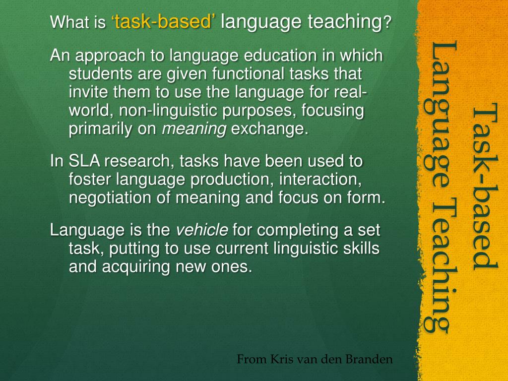 What is ‘task-based’ language teaching? An approach to language education in which students are given functional tasks that invite them to use the language for real-world, non-linguistic purposes, focusing primarily on meaning exchange. In SLA research, tasks have been used to foster language production, interaction, negotiation of meaning and focus on form. Language is the vehicle for completing a set task, putting to use current linguistic skills and acquiring new ones. Task-based Language Teaching From Kris van den Branden