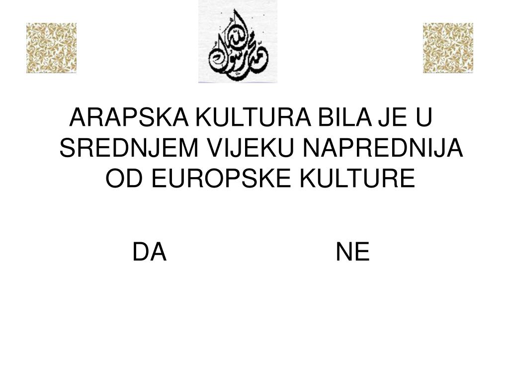 ARAPSKA KULTURA BILA JE U SREDNJEM VIJEKU NAPREDNIJA OD EUROPSKE KULTURE DA NE