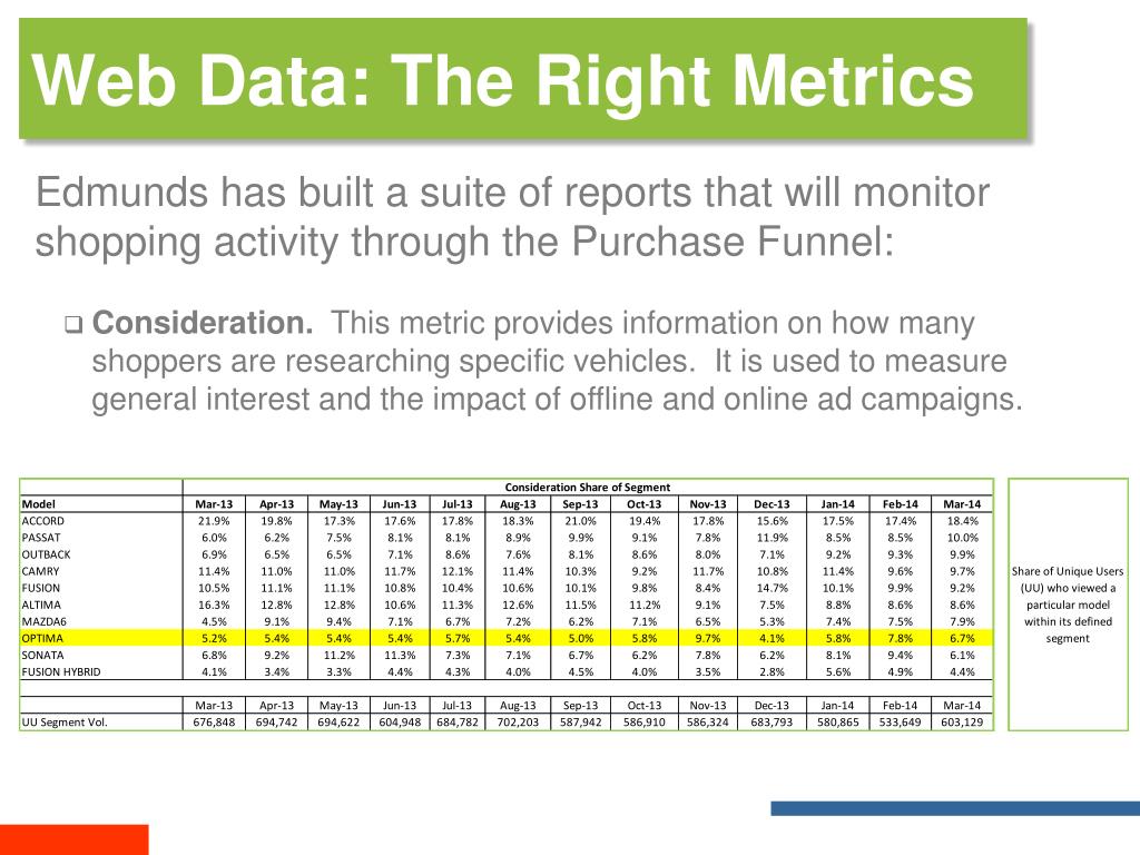 Web Data: The Right Metrics • Edmunds has built a suite of reports that will monitor shopping activity through the Purchase Funnel: • Consideration. This metric provides information on how many shoppers are researching specific vehicles. It is used to measure general interest and the impact of offline and online ad campaigns.