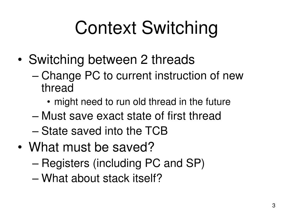 Context Switching • Switching between 2 threads • Change PC to current instruction of new thread • might need to run old thread in the future • Must save exact state of first thread • State saved into the TCB • What must be saved? • Registers (including PC and SP) • What about stack itself?