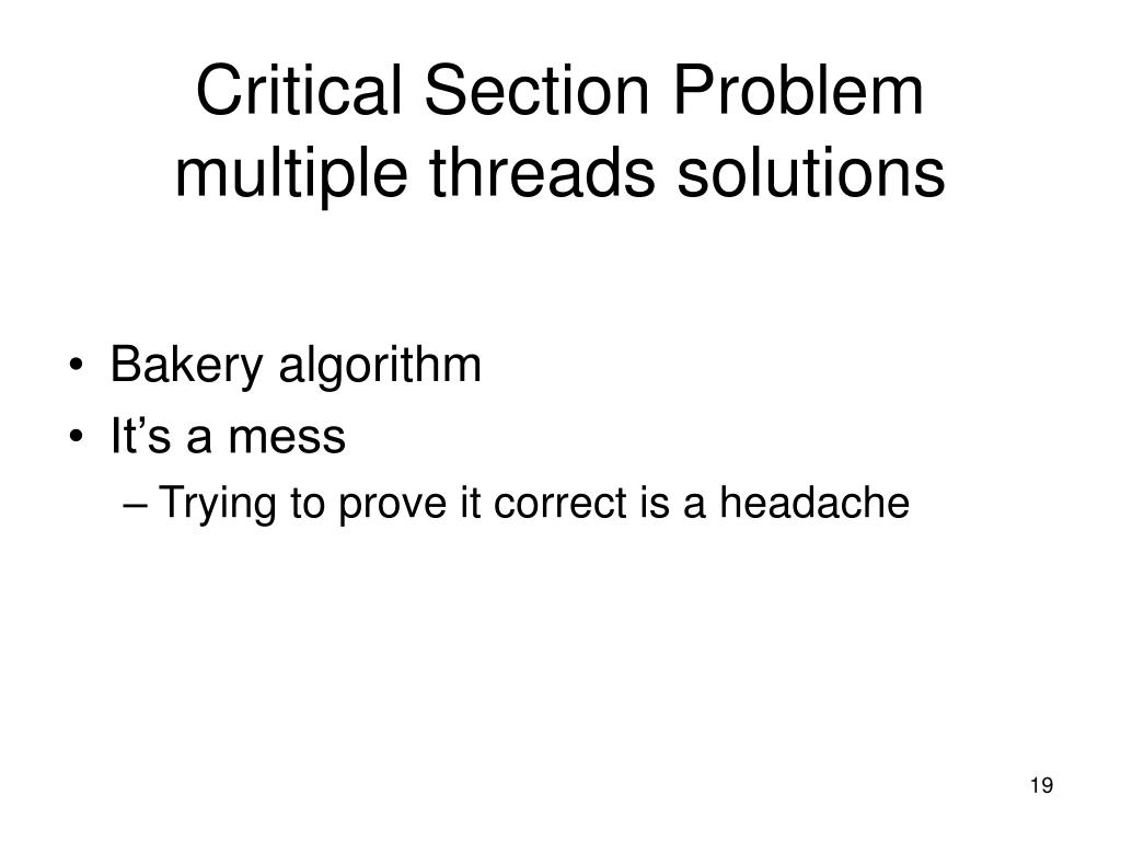 Critical Section Problemmultiple threads solutions • Bakery algorithm • It’s a mess • Trying to prove it correct is a headache
