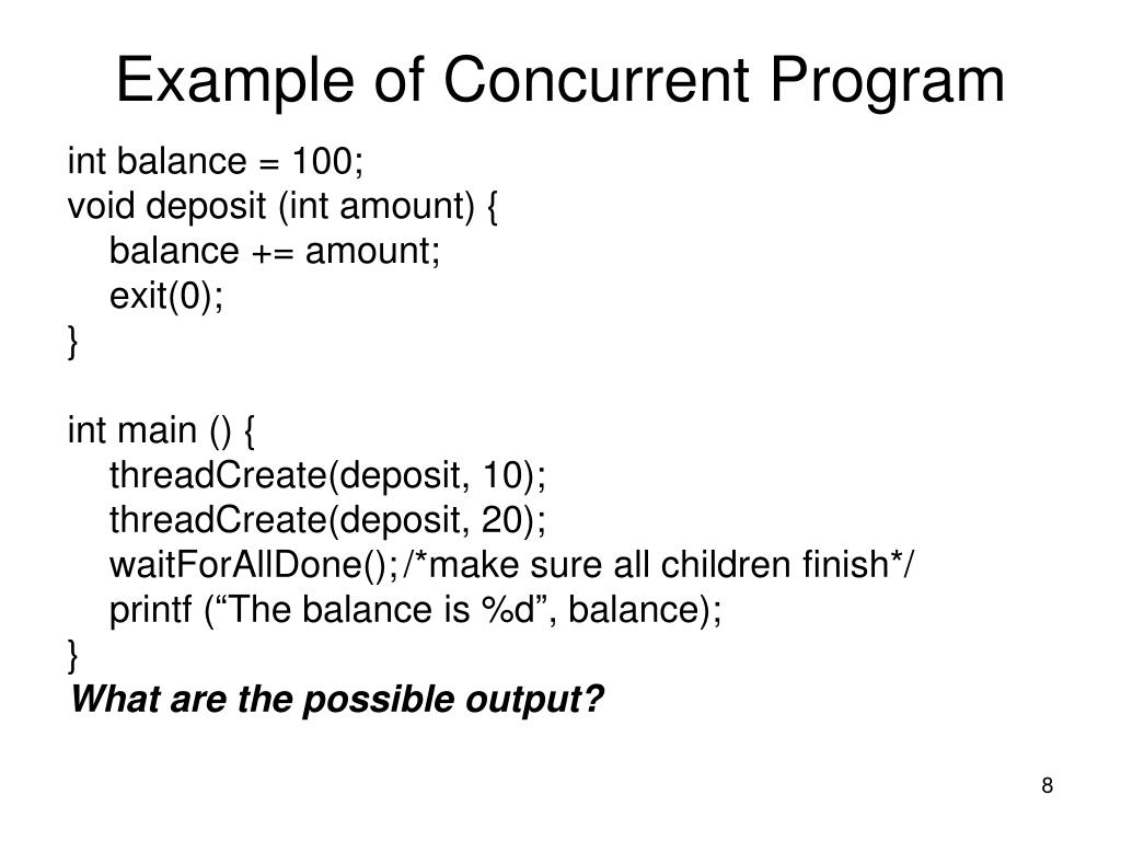 Example of Concurrent Program int balance = 100; void deposit (int amount) { balance += amount; exit(0); } int main () { threadCreate(deposit, 10); threadCreate(deposit, 20); waitForAllDone(); /*make sure all children finish*/ printf (“The balance is %d”, balance); } What are the possible output?