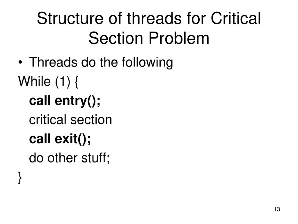 Structure of threads for Critical Section Problem • Threads do the following While (1) { call entry(); critical section call exit(); do other stuff; }