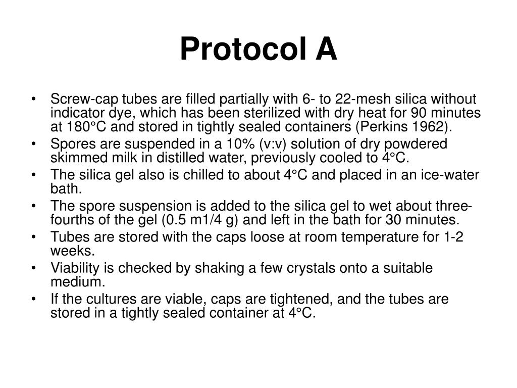 Protocol A • Screw-cap tubes are filled partially with 6- to 22-mesh silica without indicator dye, which has been sterilized with dry heat for 90 minutes at 180°C and stored in tightly sealed containers (Perkins 1962). • Spores are suspended in a 10% (v:v) solution of dry powdered skimmed milk in distilled water, previously cooled to 4°C. • The silica gel also is chilled to about 4°C and placed in an ice-water bath. • The spore suspension is added to the silica gel to wet about three-fourths of the gel (0.5 m1/4 g) and left in the bath for 30 minutes. • Tubes are stored with the caps loose at room temperature for 1-2 weeks. • Viability is checked by shaking a few crystals onto a suitable medium. • If the cultures are viable, caps are tightened, and the tubes are stored in a tightly sealed container at 4°C.