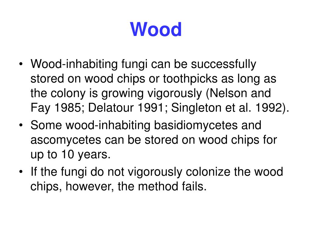 Wood • Wood-inhabiting fungi can be successfully stored on wood chips or toothpicks as long as the colony is growing vigorously (Nelson and Fay 1985; Delatour 1991; Singleton et al. 1992). • Some wood-inhabiting basidiomycetes and ascomycetes can be stored on wood chips for up to 10 years. • If the fungi do not vigorously colonize the wood chips, however, the method fails.