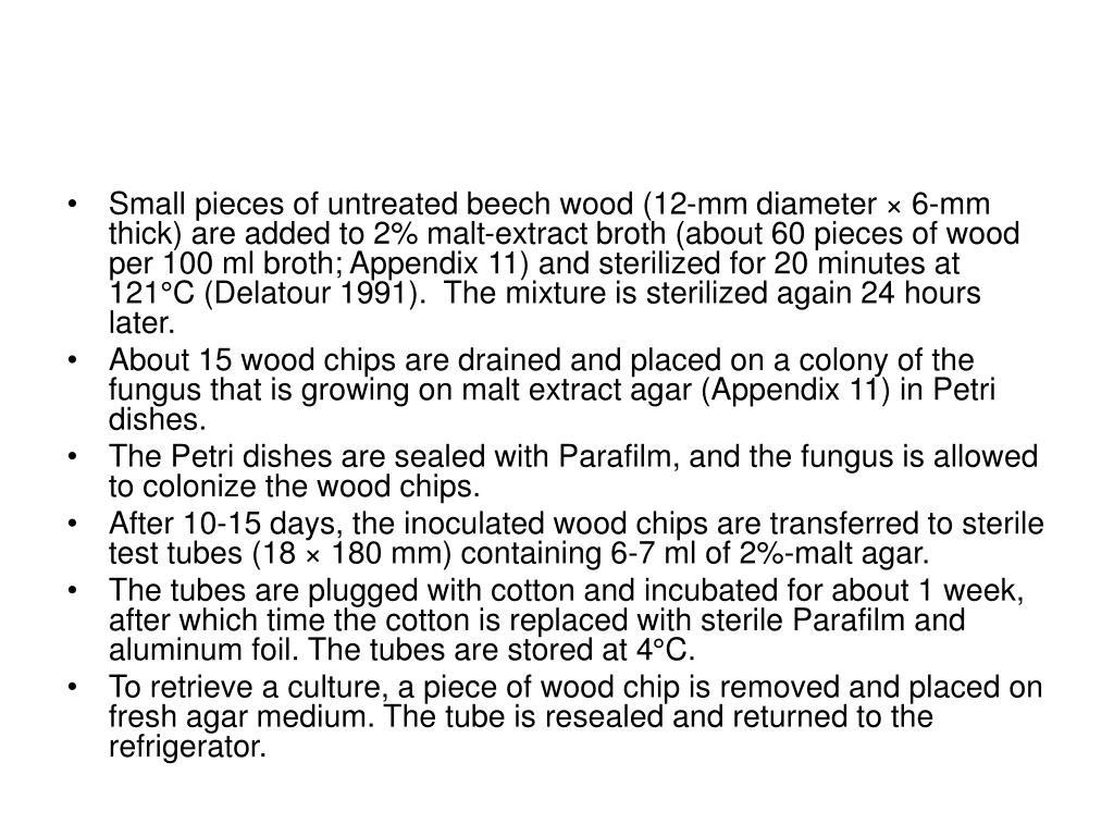 Small pieces of untreated beech wood (12-mm diameter × 6-mm thick) are added to 2% malt-extract broth (about 60 pieces of wood per 100 ml broth; Appendix 11) and sterilized for 20 minutes at 121°C (Delatour 1991). The mixture is sterilized again 24 hours later. • About 15 wood chips are drained and placed on a colony of the fungus that is growing on malt extract agar (Appendix 11) in Petri dishes. • The Petri dishes are sealed with Parafilm, and the fungus is allowed to colonize the wood chips. • After 10-15 days, the inoculated wood chips are transferred to sterile test tubes (18 × 180 mm) containing 6-7 ml of 2%-malt agar. • The tubes are plugged with cotton and incubated for about 1 week, after which time the cotton is replaced with sterile Parafilm and aluminum foil. The tubes are stored at 4°C. • To retrieve a culture, a piece of wood chip is removed and placed on fresh agar medium. The tube is resealed and returned to the refrigerator.