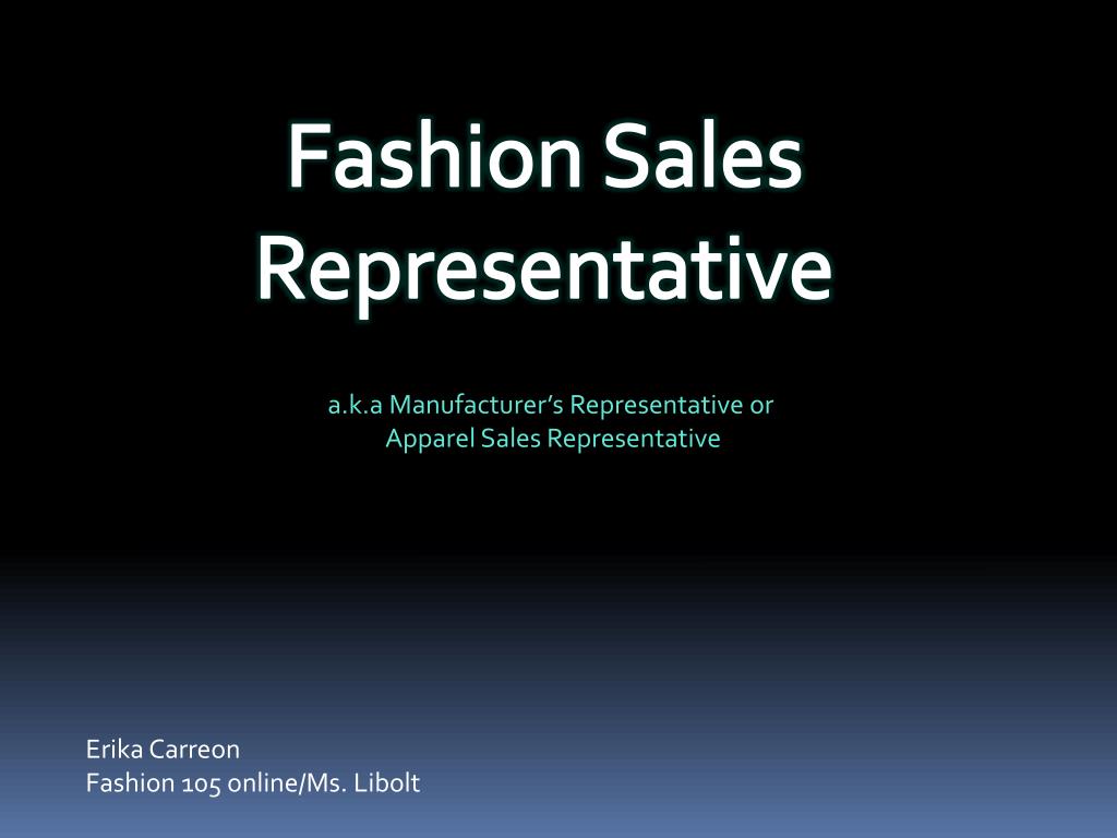 Fashion Sales Representative. a.k.a Manufacturer’s Representative or Apparel Sales Representative. Erika Carreon Fashion 105 online/Ms. Libolt. Job duties. Solicit orders from new and prospective customers in a certain geographical area