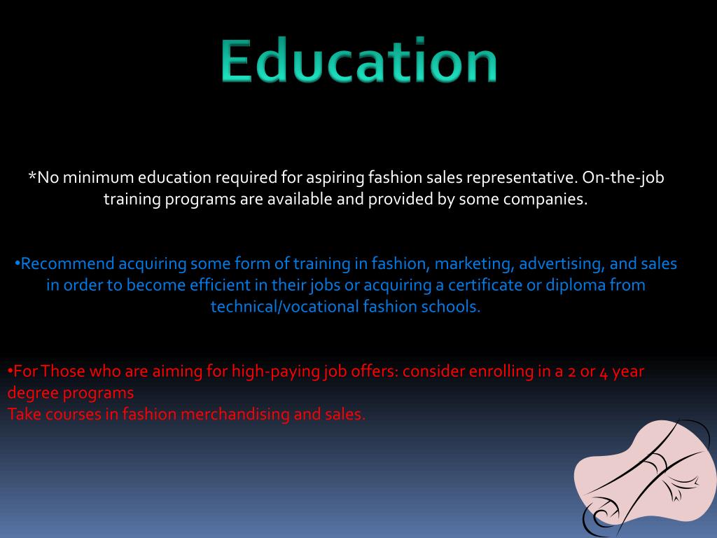 Education • *No minimum education required for aspiring fashion sales representative. On-the-job training programs are available and provided by some companies. • Recommend acquiring some form of training in fashion, marketing, advertising, and sales in order to become efficient in their jobs or acquiring a certificate or diploma from technical/vocational fashion schools. • For Those who are aiming for high-paying job offers: consider enrolling in a 2 or 4 year degree programs • Take courses in fashion merchandising and sales.