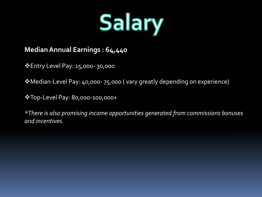 Salary • Median Annual Earnings : 64,440 • Entry Level Pay: 15,000- 30,000 • Median-Level Pay: 40,000- 75,000 ( vary greatly depending on experience) • Top-Level Pay: 80,000-100,000+ • *There is also promising income opportunities generated from commissions bonuses and incentives.