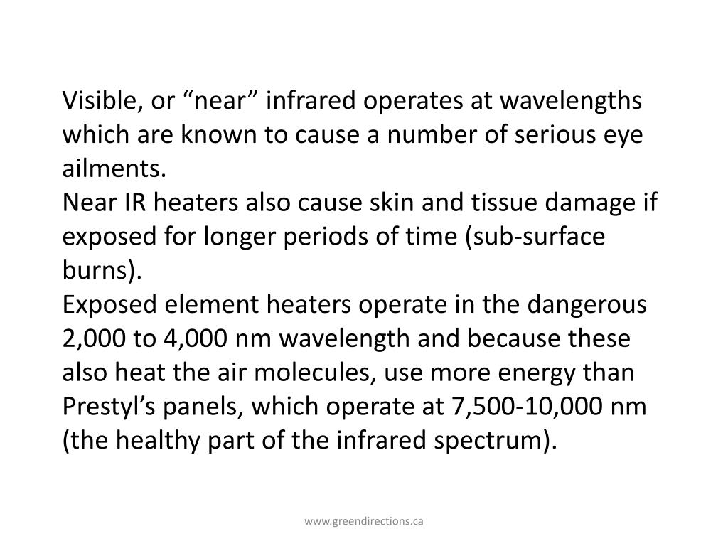 Visible, or “near” infrared operates at wavelengths which are known to cause a number of serious eye ailments. Near IR heaters also cause skin and tissue damage if exposed for longer periods of time (sub-surface burns). Exposed element heaters operate in the dangerous 2,000 to 4,000 nm wavelength and because these also heat the air molecules, use more energy than Prestyl’s panels, which operate at 7,500-10,000 nm (the healthy part of the infrared spectrum). www.greendirections.ca