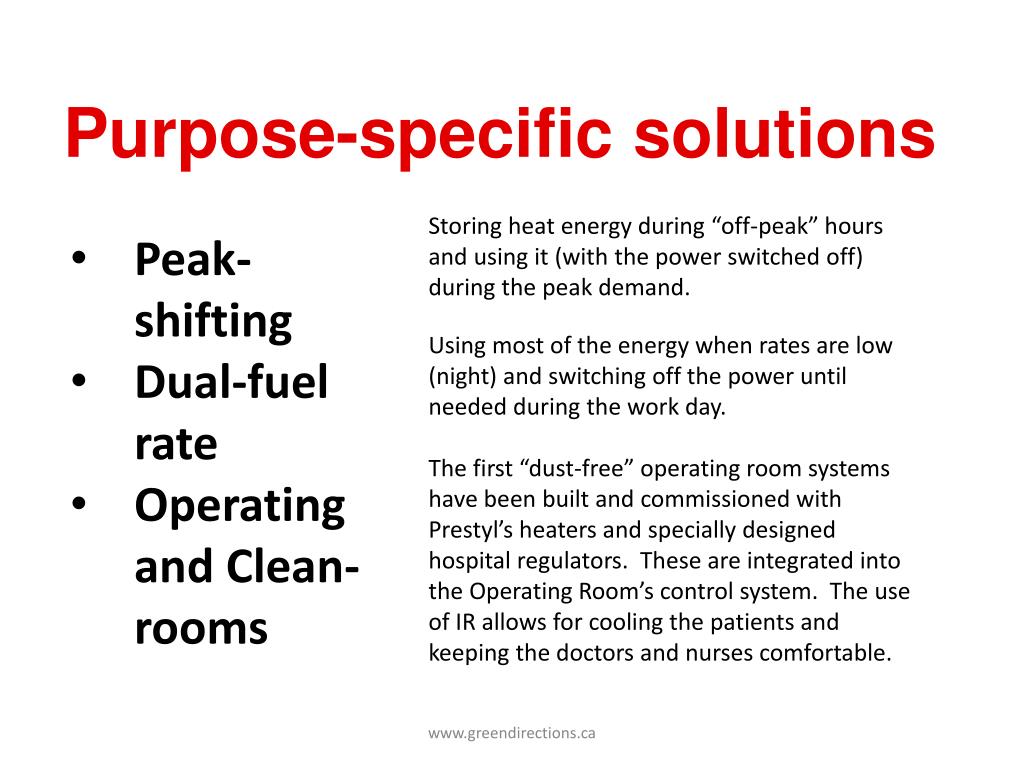 Purpose-specific solutions Storing heat energy during “off-peak” hours and using it (with the power switched off) during the peak demand. Using most of the energy when rates are low (night) and switching off the power until needed during the work day. The first “dust-free” operating room systems have been built and commissioned with Prestyl’s heaters and specially designed hospital regulators. These are integrated into the Operating Room’s control system. The use of IR allows for cooling the patients and keeping the doctors and nurses comfortable. • Peak-shifting • Dual-fuel rate • Operating and Clean-rooms www.greendirections.ca