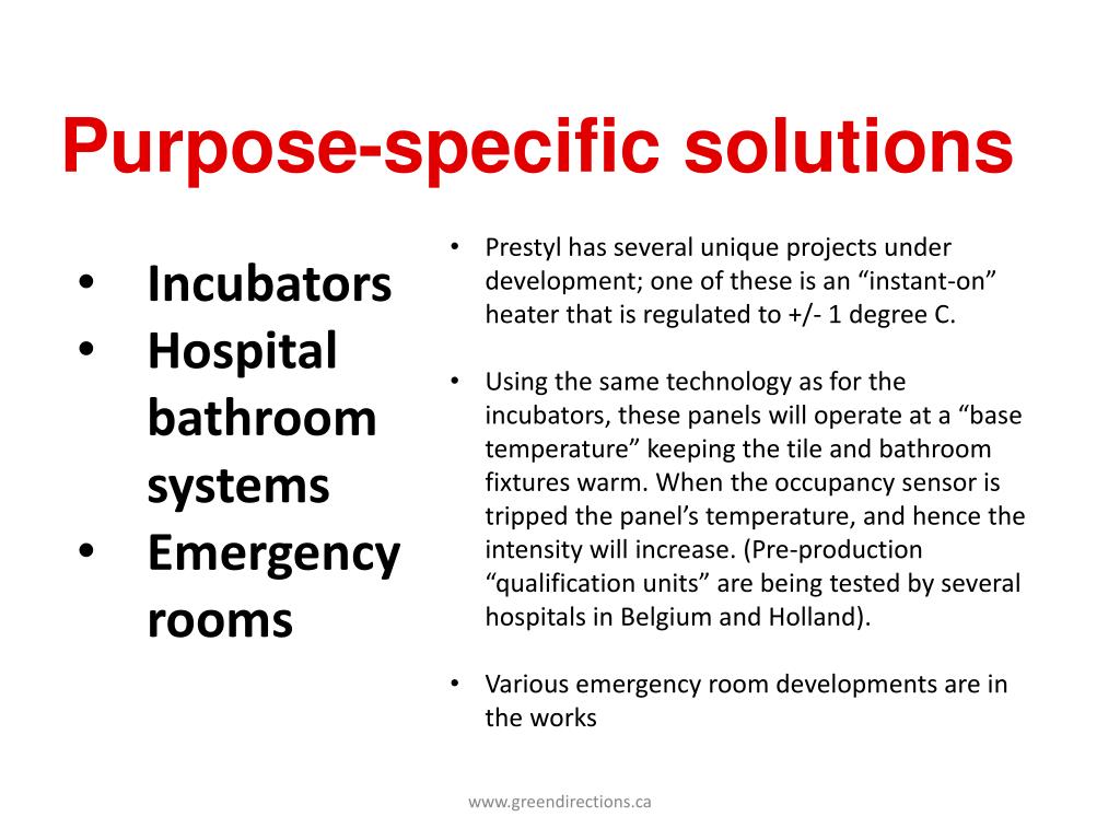Purpose-specific solutions • Prestyl has several unique projects under development; one of these is an “instant-on” heater that is regulated to +/- 1 degree C. • Using the same technology as for the incubators, these panels will operate at a “base temperature” keeping the tile and bathroom fixtures warm. When the occupancy sensor is tripped the panel’s temperature, and hence the intensity will increase. (Pre-production “qualification units” are being tested by several hospitals in Belgium and Holland). • Various emergency room developments are in the works • Incubators • Hospital bathroom systems • Emergency rooms www.greendirections.ca