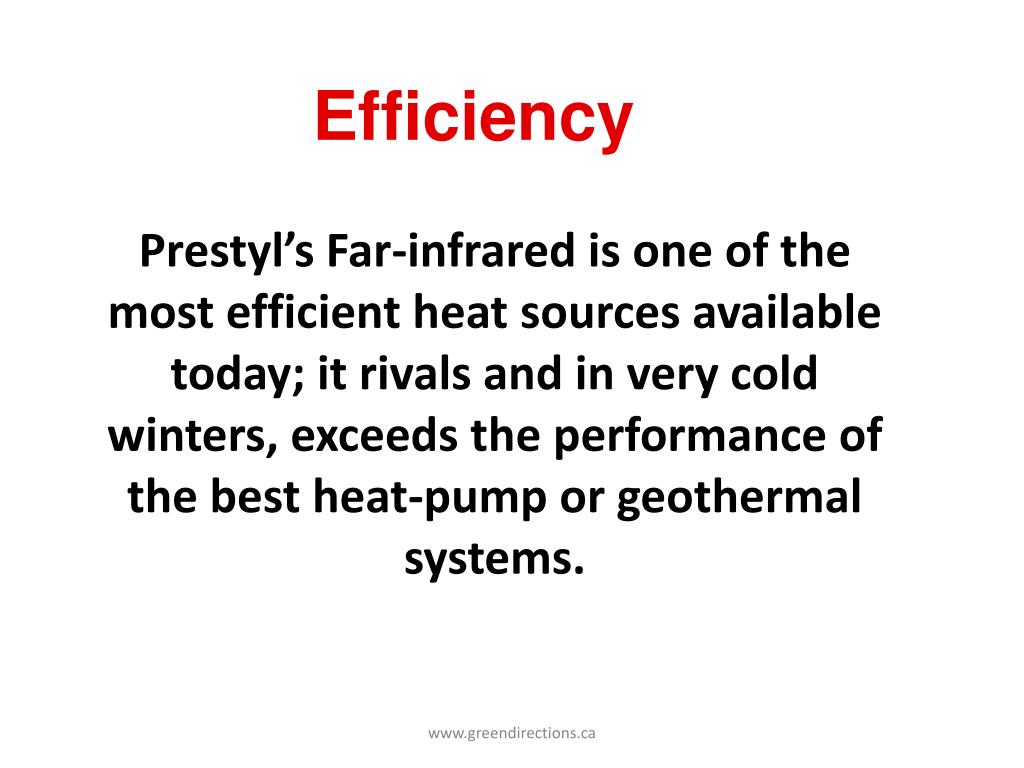 Efficiency Prestyl’s Far-infrared is one of the most efficient heat sources available today; it rivals and in very cold winters, exceeds the performance of the best heat-pump or geothermal systems. www.greendirections.ca