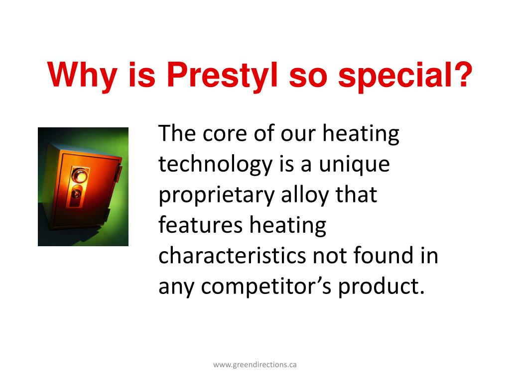 Why is Prestyl so special? The core of our heating technology is a unique proprietary alloy that features heating characteristics not found in any competitor’s product. www.greendirections.ca
