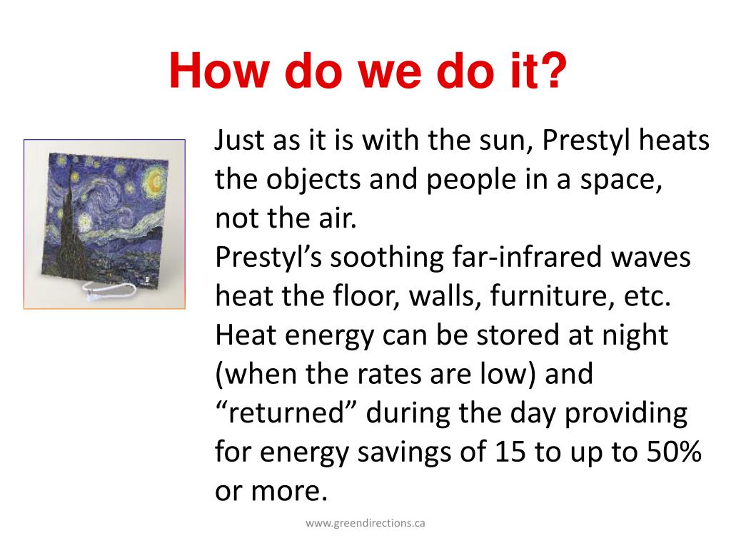 How do we do it? Just as it is with the sun, Prestyl heats the objects and people in a space, not the air. Prestyl’s soothing far-infrared waves heat the floor, walls, furniture, etc. Heat energy can be stored at night (when the rates are low) and “returned” during the day providing for energy savings of 15 to up to 50% or more. www.greendirections.ca
