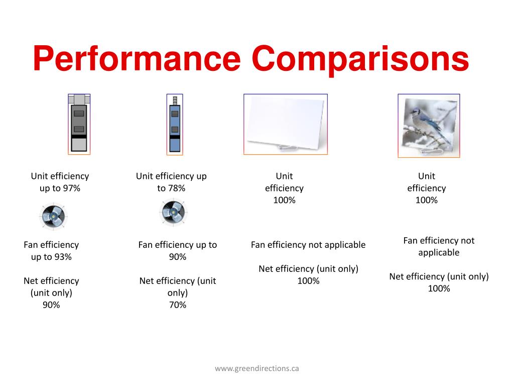 Performance Comparisons Unit efficiency up to 97% Unit efficiency up to 78% Unit efficiency 100% Unit efficiency 100% Fan efficiency not applicable Net efficiency (unit only) 100% Fan efficiency up to 93% Net efficiency (unit only) 90% Fan efficiency up to 90% Net efficiency (unit only) 70% Fan efficiency not applicable Net efficiency (unit only) 100% www.greendirections.ca