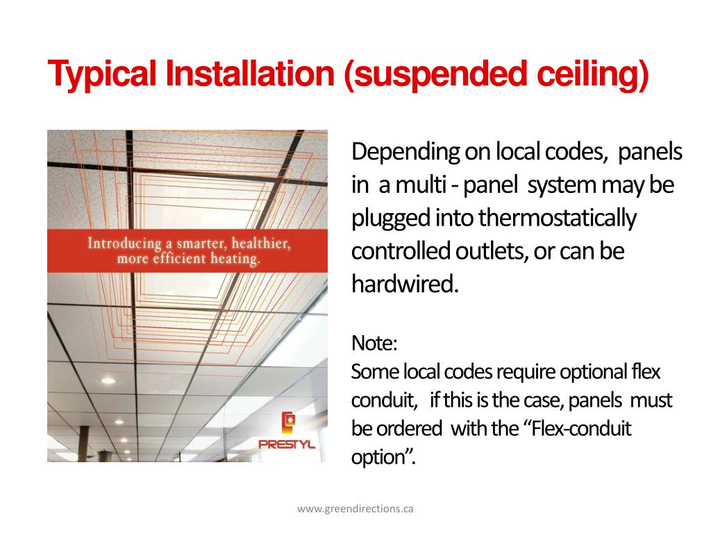 Typical Installation (suspended ceiling) Depending on local codes, panels in a multi - panel system may be plugged into thermostatically controlled outlets, or can be hardwired. Note: Some local codes require optional flex conduit, if this is the case, panels must be ordered with the “Flex-conduit option”. www.greendirections.ca