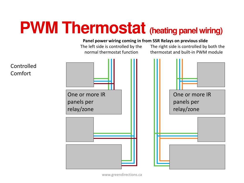 PWM Thermostat (heating panel wiring) Panel power wiring coming in from SSR Relays on previous slide The left side is controlled by the The right side is controlled by both the normal thermostat function thermostat and built-in PWM module Controlled Comfort One or more IR panels per relay/zone One or more IR panels per relay/zone www.greendirections.ca