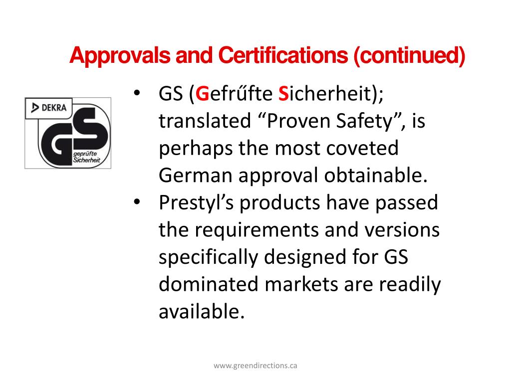 Approvals and Certifications (continued) • GS (GefrűfteSicherheit); translated “Proven Safety”, is perhaps the most coveted German approval obtainable. • Prestyl’s products have passed the requirements and versions specifically designed for GS dominated markets are readily available. www.greendirections.ca