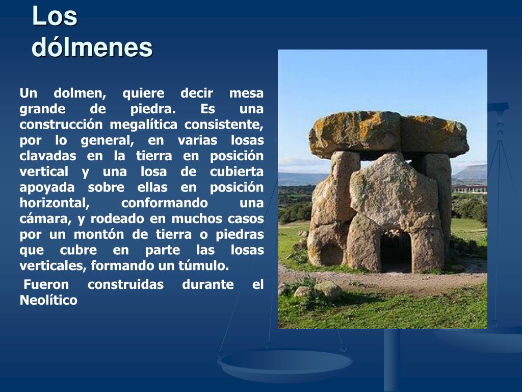 Los dólmenes Un dolmen, quiere decir mesa grande de piedra. Es una construcción megalítica consistente, por lo general, en varias losas clavadasen la tierra en posición vertical y una losa de cubierta apoyada sobre ellas en posición horizontal, conformando una cámara, y rodeado en muchos casos por un montón de tierra o piedras que cubre en parte las losas verticales, formando un túmulo. Fueron construidas durante el Neolítico