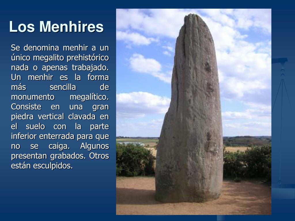 Los Menhires Se denomina menhir a un único megalito prehistórico nada o apenas trabajado. Un menhir es la forma más sencilla de monumento megalítico. Consiste en una gran piedra vertical clavada en el suelo con la parte inferior enterrada para que no se caiga. Algunos presentan grabados. Otros están esculpidos.