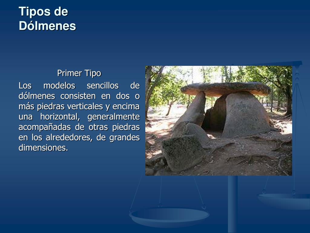 Tipos de Dólmenes Primer Tipo Los modelos sencillos de dólmenes consisten en dos o más piedras verticales y encima una horizontal, generalmente acompañadas de otras piedras en los alrededores, de grandes dimensiones.