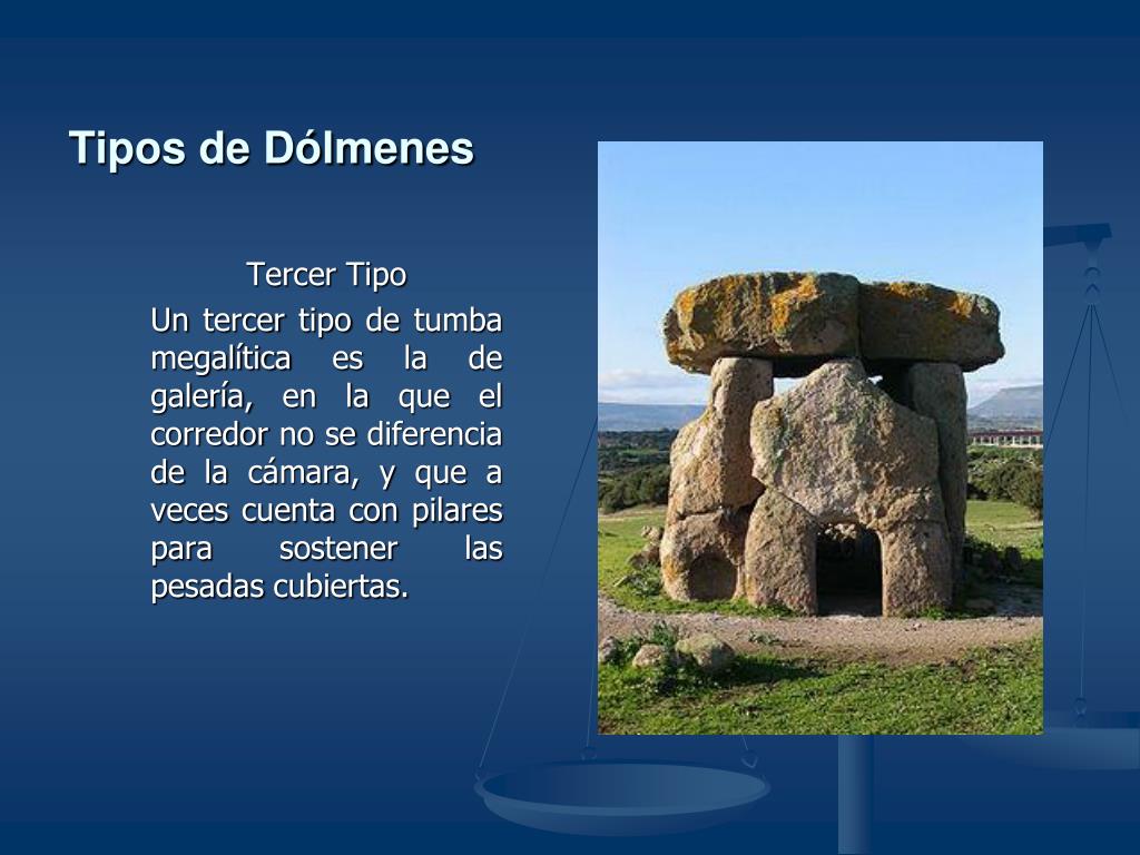 Tipos de Dólmenes Tercer Tipo Un tercer tipo de tumba megalítica es la de galería, en la que el corredor no se diferencia de la cámara, y que a veces cuenta con pilares para sostener las pesadas cubiertas.
