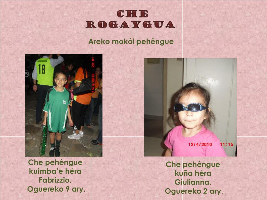 CHE Rogaygua Arekomokôipehêngue Che pehênguekuimba’ehéraFabrizzio. Oguereko 9 ary. Che pehênguekuñahéraGiulianna. Oguereko 2 ary.