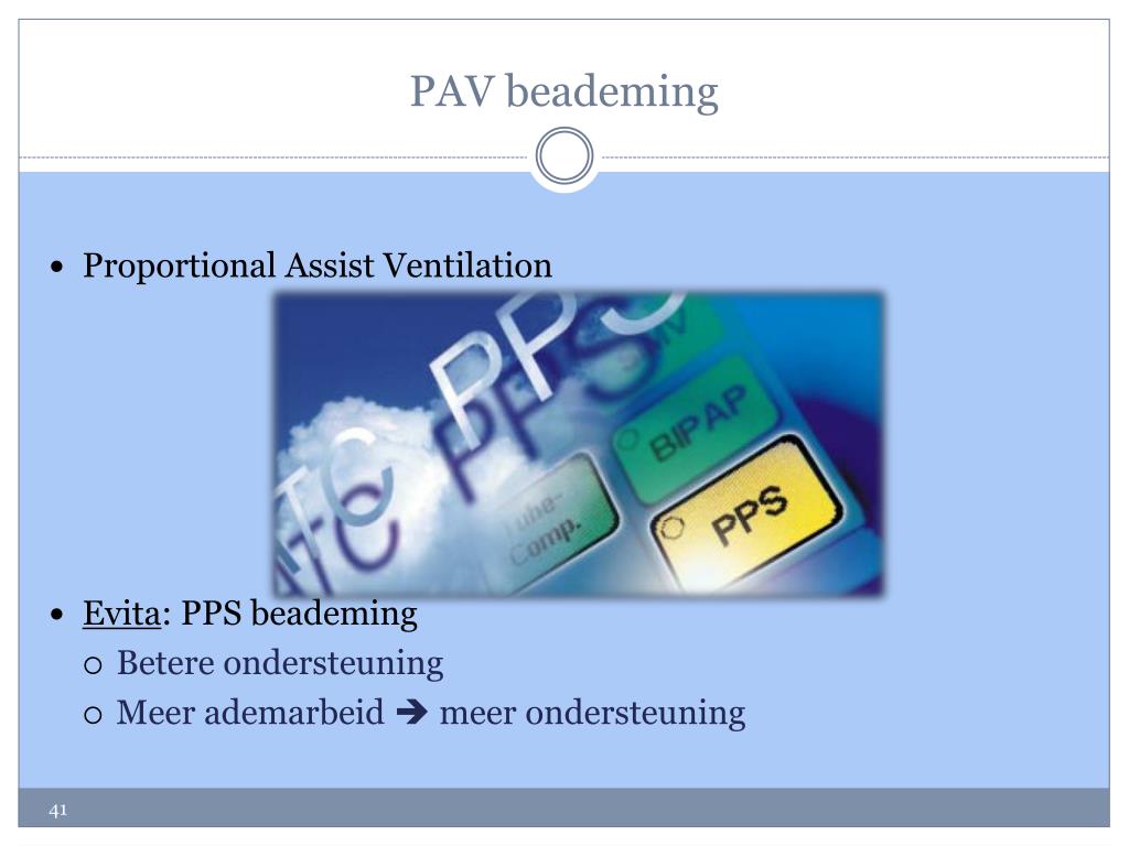 PAV beademing • Proportional Assist Ventilation • Evita: PPS beademing • Betereondersteuning • Meer ademarbeid meerondersteuning