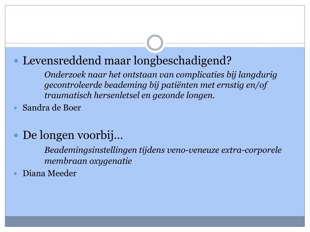 Levensreddend maar longbeschadigend? Onderzoek naar het ontstaan van complicaties bij langdurig gecontroleerde beademing bij patiënten met ernstig en/of traumatisch hersenletsel en gezonde longen. Sandra de Boer De longen voorbij…Beademingsinstellingen tijdens veno-veneuze extra-corporele membraan oxygenatie Diana Meeder