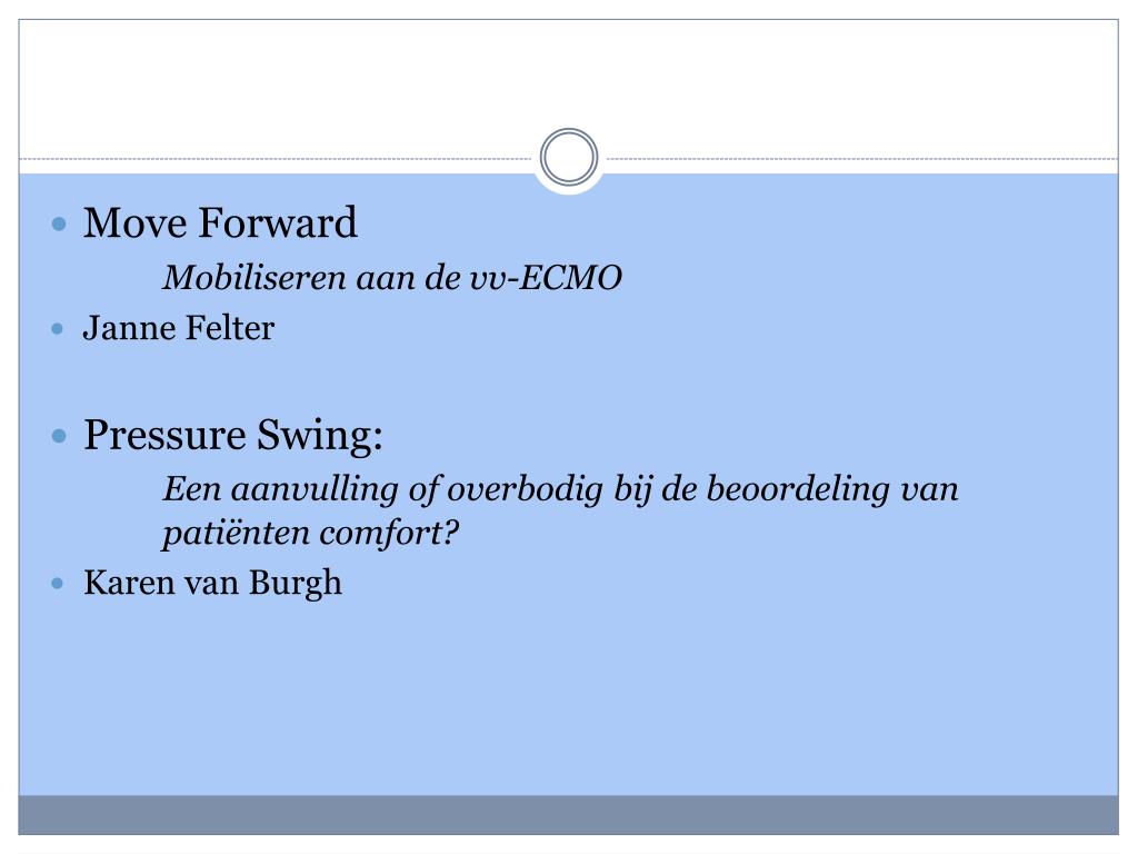 Move Forward Mobiliseren aan de vv-ECMO • Janne Felter • PressureSwing: Een aanvulling of overbodig bij de beoordeling van patiënten comfort? • Karen van Burgh