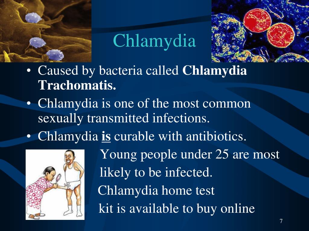 Chlamydia • Caused by bacteria called Chlamydia Trachomatis. • Chlamydia is one of the most common sexually transmitted infections. • Chlamydia is curable with antibiotics. • Young people under 25 are most likely to be infected. Chlamydia home test kit is available to buy online